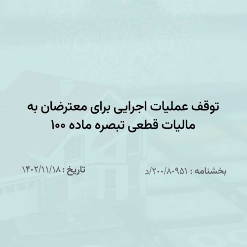 آیا نگران صدور برگ اجرایی برای مالیات قطعی خود هستید؟ بر اساس بخشنامه شماره ۲۰۰/۸۰۹۵۱/د، سازمان امور مالیاتی مقرر داشته است که چنانچه مودیان نسبت به مالیات مقطوع تعیین شده در اجرای تبصره ماده ۱۰۰ معترض بوده و شکایت خود را جهت رسیدگی در هیات حل اختلاف موضوع ماده ۲۱۶ مطرح نمایند، ادارات کل امور مالیاتی مکلفند تا زمان تعیین تکلیف نهایی و صدور رای قطعی هیات حل اختلاف، از انجام هرگونه اقدامات اجرایی خودداری کنند.