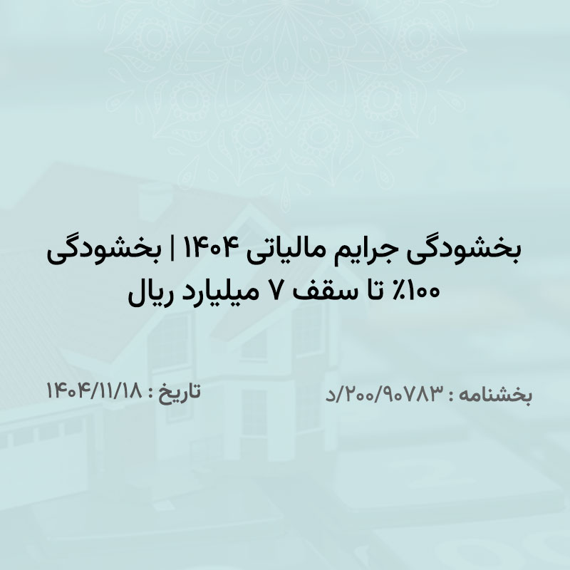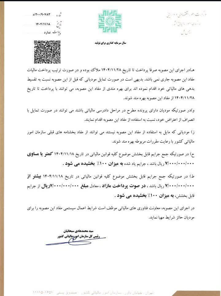 براساس مصوبه کارگروه تضمین امنیت غذایی و بهبود معیشت مردم مبنی بر اینکه: “با عنایت به دستور رئیس جمهور محترم در خصوص حمایت از کسب و کارهای خرد و صاحبان مشاغل و سایر فعالین اقتصادی در دوره اجرای سیاستگذاریهای جدید اقتصادی، جرایم قابل بخشش مالیاتی مندرج در کلیه قوانین مالیاتی مودیان فاقد بدهی مالیاتی بابت اصل مالیات یا مودیانی که بدهی مالیاتی خود را حداکثر تا تاریخ ۱۴۰۴/۱۱/۲۸ پرداخت نمایند تا سقف ۷/۰۰۰/۰۰۰/۰۰۰ ریال بخشیده میشود. در صورتی که جرایم قابل بخشش مودی بیش از مبلغ مذکور باشد نیز جرایم قابل بخشش مودی در صورت پرداخت جرایم مازاد بر سقف مذکور تا مبلغ ۷/۰۰۰/۰۰۰/۰۰۰ ریال بخشیده میشود.”